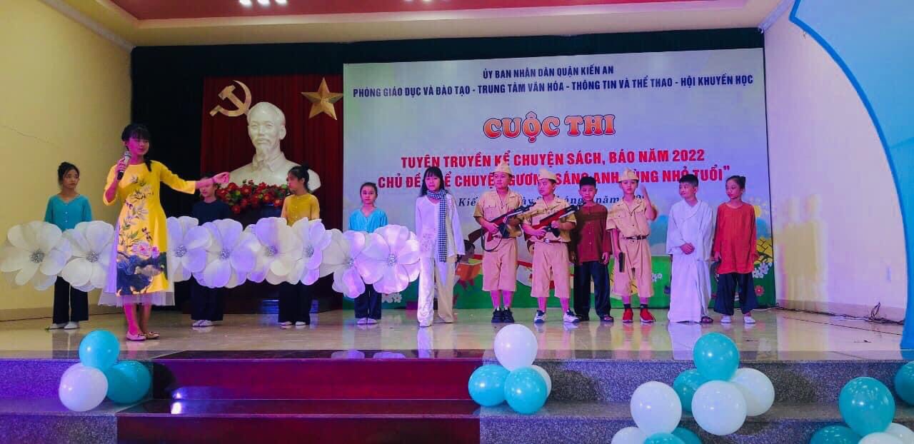 Thực hiện Kế hoạch Liên ngành số 07/KH-LN của TT Văn hóa- Thông tin và Thể thao, Phòng GD&ĐT, Hội khuyến học quận Kiến An về cuộc thi tuyên truyền kể chuyện sách, báo năm 2022 với chủ đề "Kể chuyện gương sáng anh hùng nhỏ tuổi", em Phạm Khánh Huyền- học sinh lớp 4A cùng các bạn trong đội văn nghệ của nhà trường đã gửi tới Hội thi câu chuyện về Huyền thoại Chị Võ Thị Sáu. Với sự chuẩn bị công phu về trang phục, đạo cụ cùng năng khiếu kể chuyện, sự tự tin, giọng kể truyền cảm Tiết mục đã vinh dự đạt Giải A